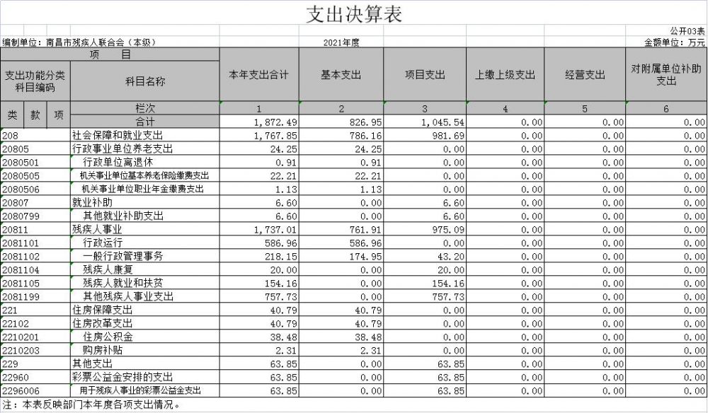 本单位2021年度支出总计1872.49万元,其中本年支出合计1872.49万元,较2020年增加75.6万元,增长4.21 %,主要原因是:残疾人就业保障金项目支出增加;年末结转和结余0 万元,较2020年减少943.5万元,下降100%,主要原因是:年末财政收回结转结余资金,以支定收。
