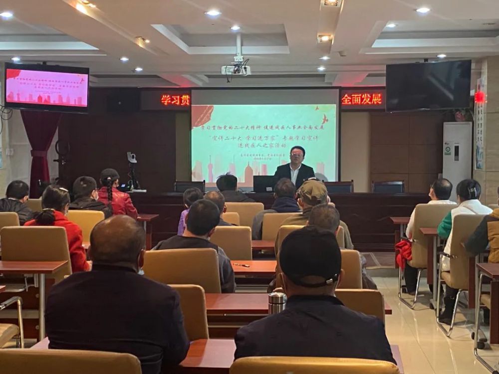 11月17日,东湖区残联党组书记、理事长张勇以“学习贯彻党的二十大精神 促进残疾人事业全面发展”为题到区残疾人之家作专题宣讲,区残联党员干部、残疾人服务机构代表、残疾人学员共计50余人参加宣讲会。