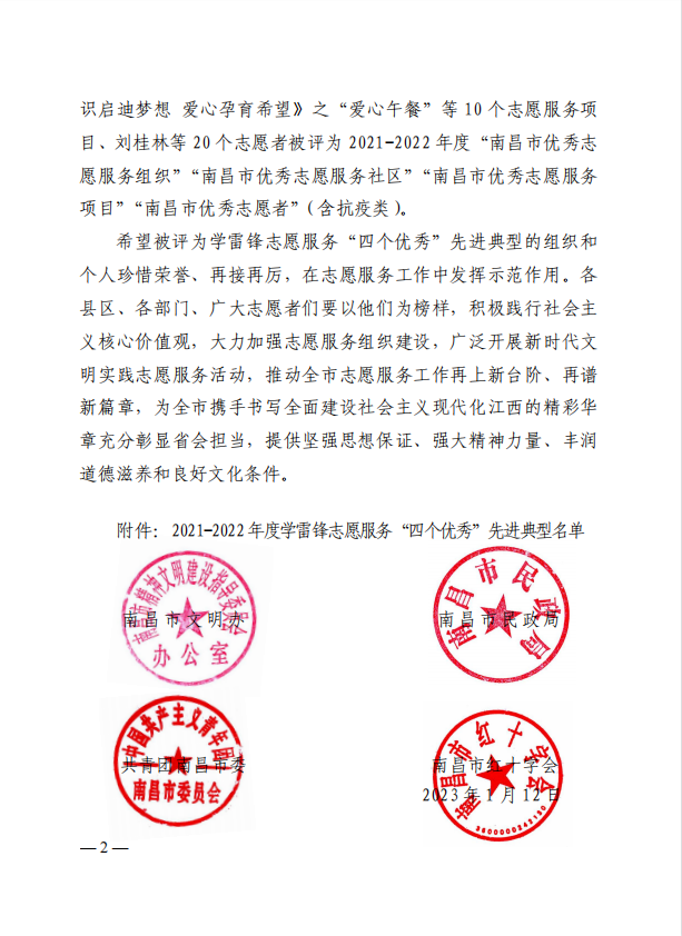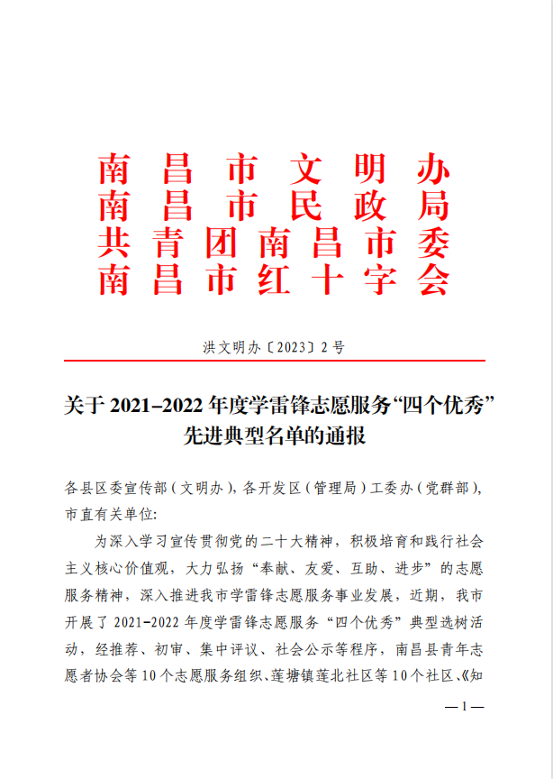 1月12日,南昌市文明办、南昌市民政局、共青团南昌市委、南昌市红十字会下发《关于 2021-2022 年度学雷锋志愿服务“四个优秀”先进典型名单的通报》(洪文明办〔2023〕2号),东湖区聋协主席李焕秋获评“南昌优秀志愿者”。