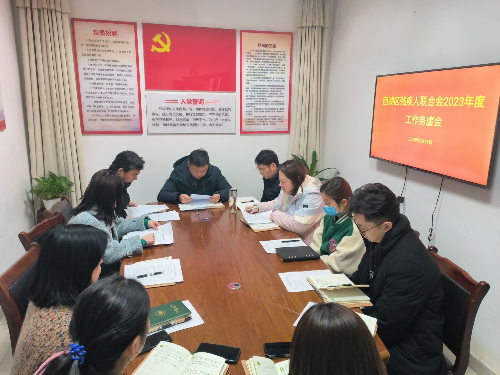 会前,西湖区残联办公室、康复股、教就股、组宣股和维权股分别结合各自岗位工作职责,认真梳理形成各股室年度工作计划安排初稿,并在会上逐一进行年度工作计划汇报,经分管领导补充完善要求,主要领导同意定稿安排后,形成2023年度工作计划,以目标导向推动残联工作新格局。