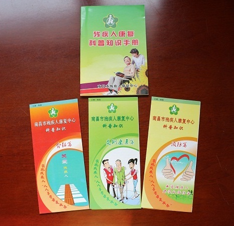 图为南昌市残疾人康复中心精心编印的《残疾人康复科普知识手册》和《残疾人康复知识宣传折页》