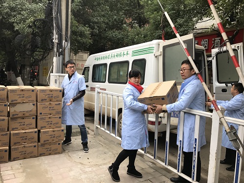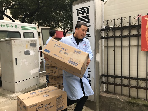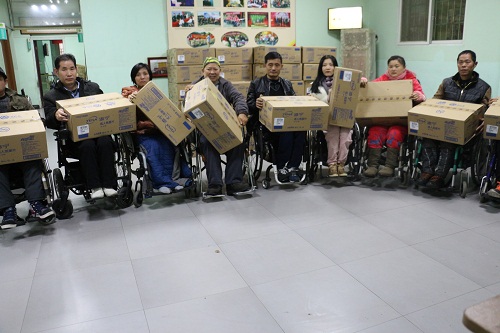 在“中途之家”,残友们接到了南昌市残疾人康复中心给他们送去的尿不湿、护理垫、防褥疮座垫等辅助用品以及大米,食用油等生活物资,个个脸上洋溢着幸福感动的笑容。