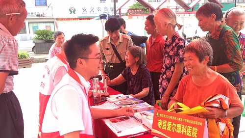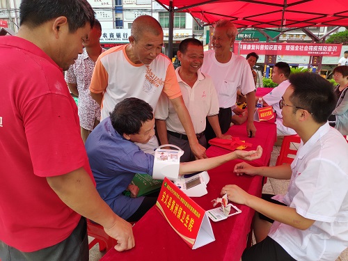 “大叔,这是关于残疾预防的宣传手册,您看一下,有什么不明白的地方可以问我们……”;“阿姨,您的眼睛有轻微白内障,您可以抽空去我们医院进行进一步检查……”;在黄洲镇设置的咨询台前,南昌市残疾人康复中心工作人员及爱尔眼科医院医生为前来的村民进行答疑解惑和进行眼部健康检查。活动现场还悬挂了横幅,摆放了有关康复知识的宣传展板,南昌市安定医院及黄州镇卫生院的医务人员为群众进行了量血压、测血糖等义诊服务。现场部分残疾人也领取到了轮椅、尿不湿等辅具用品。形式多样、内容丰富的宣传活动得到了群众的一致好评。