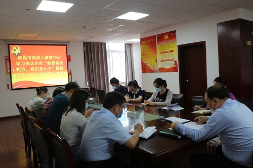 4月30日,南昌市残疾人康复中心组织党员干部职工学习全市“彰显省会担当,我们怎么干”解放思想大讨论活动会议精神。