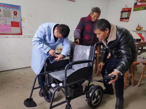 南昌市残疾人康复中心工作人员先后来到安义县东阳镇战坪村象田村、南昌县三江镇汗塘村等地,为有需求的残疾人送去了轮椅等辅具。在残疾人家里,康复中心工作人员为残疾人安装了轮椅,并现场指导他们如何使用,讲解了辅具使用的注意事项;同时还宣传了康复辅具相关政策,征求了他们在残疾人康复辅具方面的意见建议等。