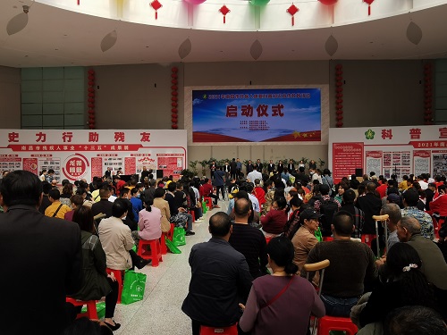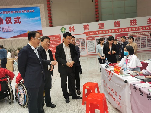 为深入开展党史学习教育,贯彻落实2021年市残联“转作风、优环境”活动年工作要求,进一步提高公众残疾预防意识和残疾人的康复意识,全面提升预防康复精准服务水平,4月23日上午,以“关爱残疾人、共启新征程”为主题的2021年南昌市残疾人康复科普知识宣传教育活动启动仪式在南昌县文化会展中心举行。省残联党组成员、副理事长黄建国,市残联党组书记、理事长余颖,南昌县委常委胡朝辉,省残联三级调研员曾建莉,市残联党组成员、副理事长邓林和等领导出席活动,活动由市残联党组成员、副理事长吴卫平主持。