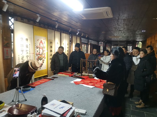 随后,大家来到残疾人自强模范蔡沐江的创业工作室——沐江书屋,蔡沐江对大家的到来表示欢迎,并现场表演倒口书的高超技艺,写下“万象更新”四个大字,祝福大家在新一年的工作中再创佳绩。
