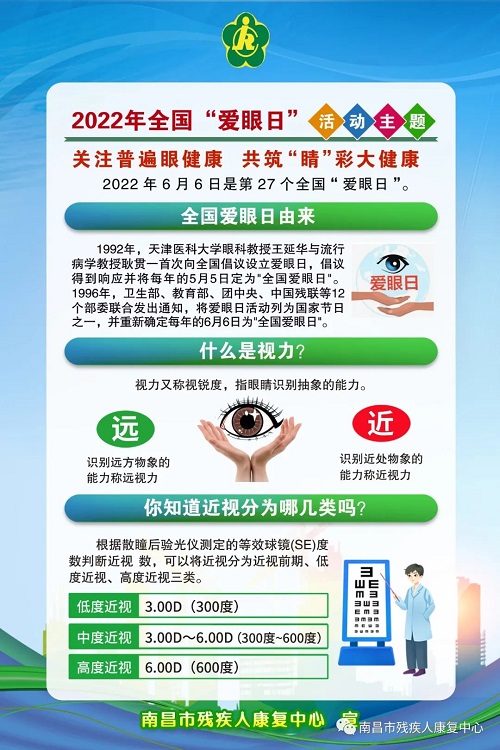 为进一步提高市民健康素质,增强全民爱眼护眼意识,避免和减少眼疾的发生,6月6日“全国爱眼日”当天,南昌市残联举办了以“关注普遍眼健康,共筑‘睛’彩大健康”为主题的南昌市第27个“全国爱眼日”宣传教育活动。