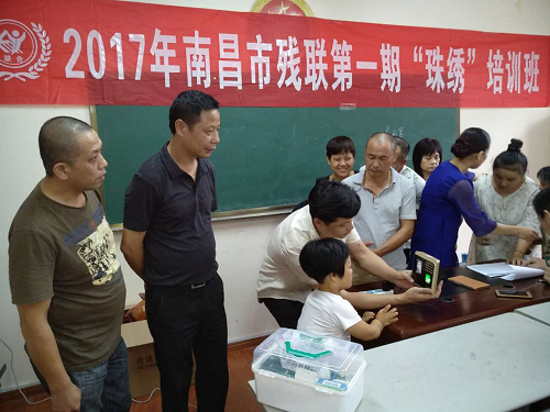 8月8日下午,2017年南昌市残联第二期“丝网花”培训班在江西省联合职业培训学校开班,市残联就业中心主任张望初一行先后参观了培训教室及设施设备,并对学员进行了脸谱录入等开班准备工作。60名残疾人学员将进行为期44天的培训课程,学习串珠编织技能。