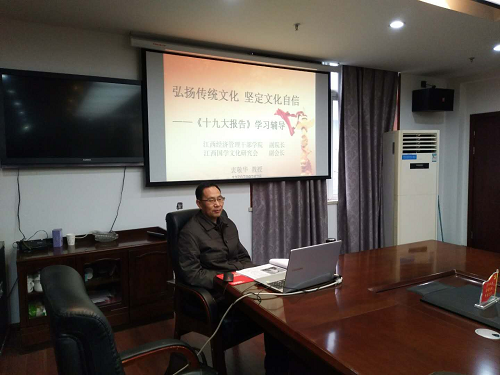 在全市残联上下掀起学习南昌市残疾人联合会第五次代表大会精神高潮之际,1月26日上午,市残联就业中心邀请江西经济管理干部学院副院长衷敬华教授为全体党员干部职工进行十九大报告学习辅导讲座。讲座的主题是“弘扬传统文化、坚定文化自信”。市残联副理事长吴卫平主持,市残联调研员章建辉参加讲座。