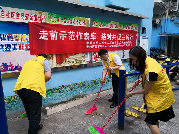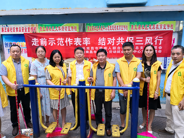 6月29日下午,市残联机关党总支、就业中心党支部和康王庙社区党支部全体党员在社区广场开展“走前示范作表率,结对共促三风行”主题活动,向社区居民发放了《好家风好家训格言警句汇总》100份资料。随后在市残联党组成员、副理事长吴卫平的带领下,开展清洁家园、帮助打扫庭院,通过2个多小时的劳动,彻底清理康王庙社区人行道、楼道卫生死角等,以实际行动积极投身邻里互助的社区志愿服务中,为推进党员干部在兴家风、淳民风、正社风活动中走前头、作表率。