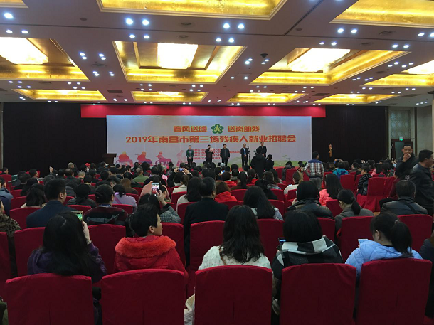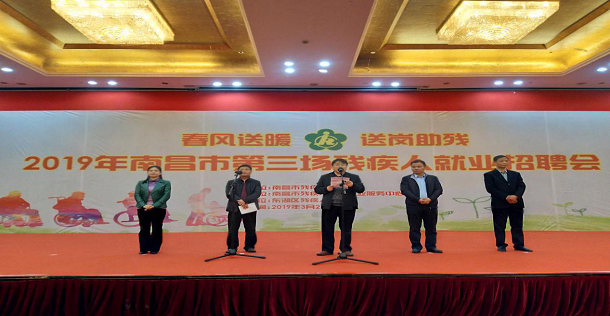 为深入贯彻落实习近平新时代中国特色社会主义思想,助推残疾人就业创业,帮助残疾人脱贫解困。3月28日上午,由南昌市残疾人联合会主办,市残联就业中心承办,东湖区残疾人联合会协办的“春风送暖 送岗助残”2019年南昌市第三场残疾人就业招聘会在省委滨江宾馆隆重举行。市残联副理事长吴卫平、东湖区政府副区长杨峻出席启动仪式,市残联教就处处长宗慧民主持。