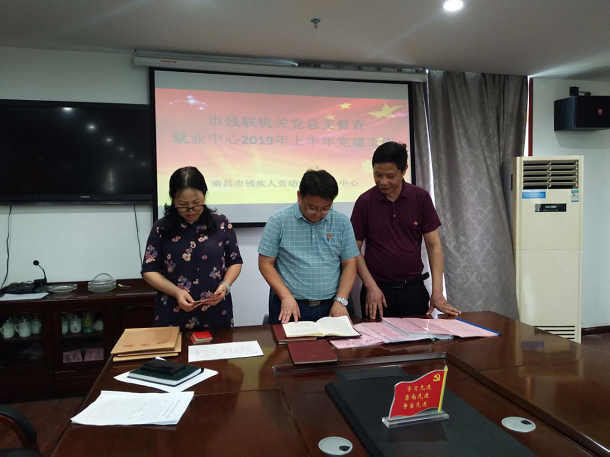 7月22日上午,市残联党组成员、副理事长吴卫平,市残联机关党总支专职副书记周红华一行到就业中心督查2019年上半年党建工作。
