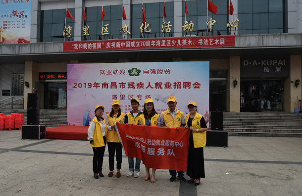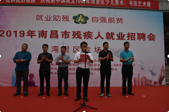 在全中国扶贫日来临之际,为了给更多残疾人和用工单位双向需求提供精准服务,集中帮扶残疾人失业人员和有就业意向的残疾人实现就业创业,10月11日上午,南昌市残联和湾里区残联在湾里区文化活动中心联合举办以“就业助残 自强脱贫”为主题的2019年南昌市残疾人就业招聘会(湾里专场)。市残联党组成员、副理事长吴卫平,教就处处长宗慧民,就业中心主任张望初,湾里区副区长吴一建,湾里区残联理事长贺学风出席。教就处处长宗慧民主持仪式,市残联党组成员、副理事长吴卫平宣布活动开始