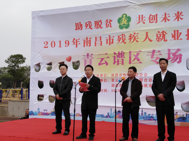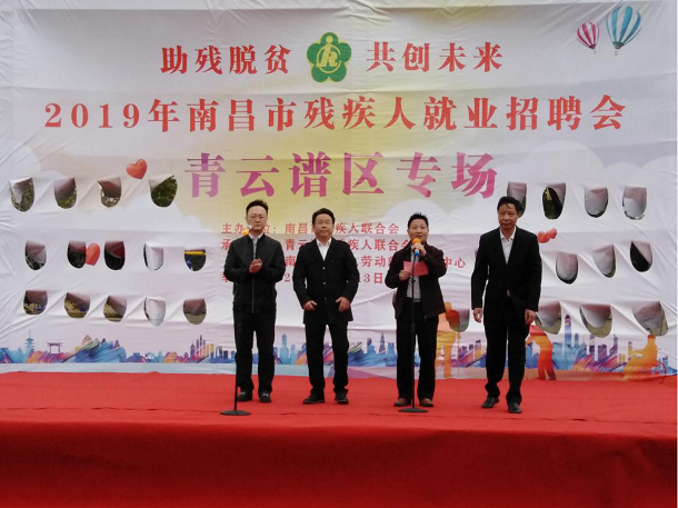 青云谱区残联理事长程晟首先致辞,残友代表姜妮和爱心企业代表南昌甄图匠科技有限公司总经理郑立军分别作了表态发言。最后,南昌市残联党组成员、副理事长吴卫平讲话并宣布2019年南昌市残疾人就业招聘会(青云谱区专场)活动开始。