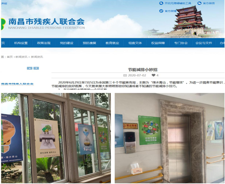 为积极贯彻落实南昌市公共机构节能宣传周活动安排,6月29日至7月5日,南昌市残联在办公大楼开展以“绿水青山,节能增效”为主题的节能宣传周活动。