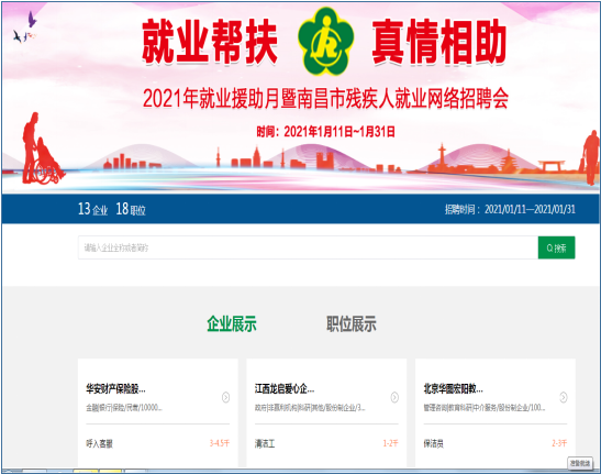 为全面贯彻党的十九大和十九届二中、三中、四中、五中全会精神,落实《人力资源社会保障部 中国残联关于开展2021年就业援助月专项活动的通知》文件精神,南昌市残疾人联合会组织各县(区)、开发区、湾里管理局残联于2021年1月上旬至1月底全面开展以“就业帮扶 真情相助”为主题的“2021年就业援助月专项活动”。