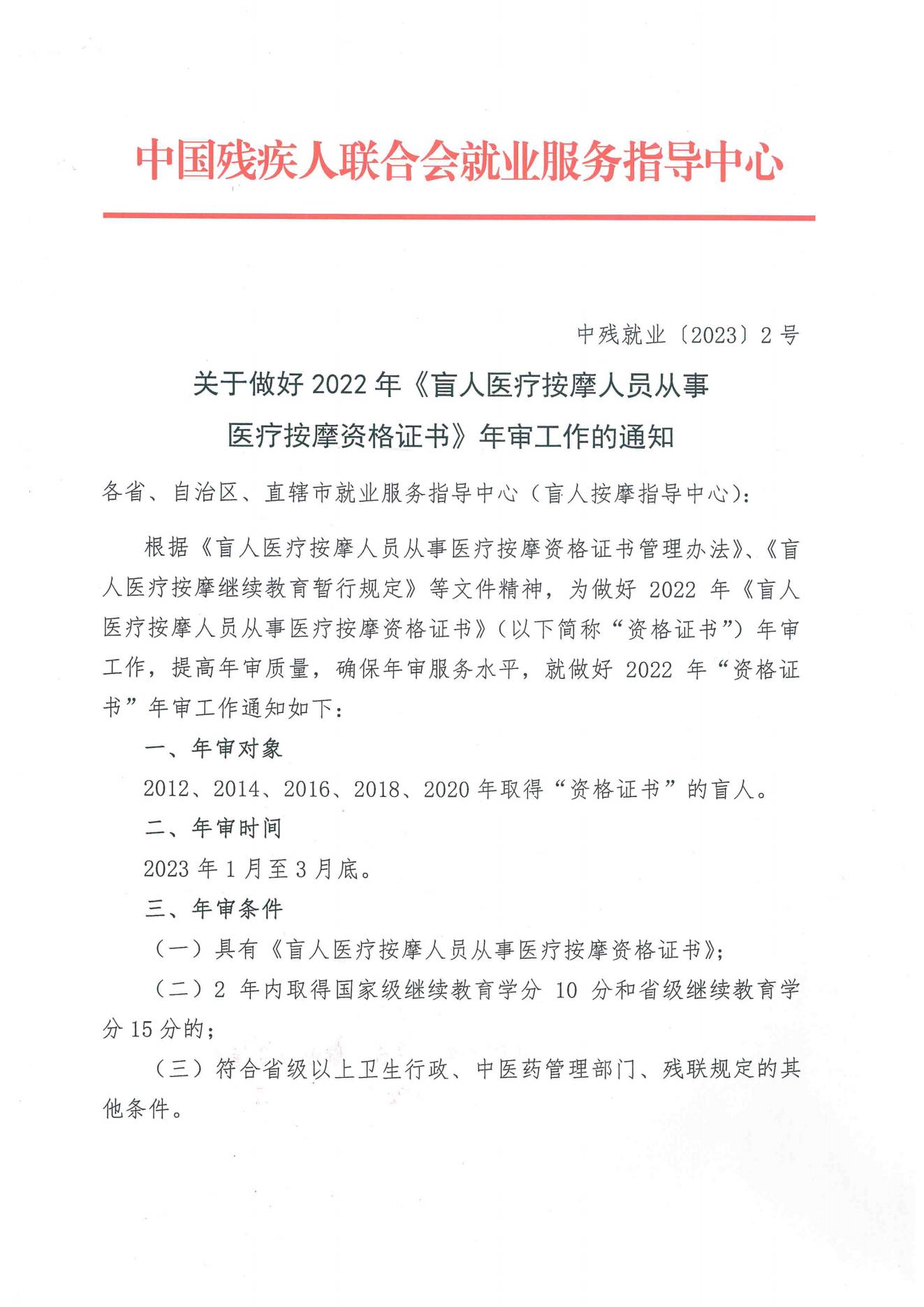 附件:关于做好2022年《盲人医疗按摩人员从事医疗按摩资格证书》年审工作的通知(中残就业〔2023〕2号)