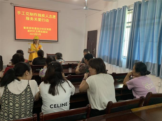 为大力弘扬中华民族扶残助残优良传统,让关爱的阳光照亮每一位残障人士的心灵,丰富残障人士的精神文化生活,提高他们的动手能力,9月1`58日,董家窑街道龙沙社区党委、新时代文明实践站开展手工花制作残疾人志愿服务关爱行动,辖区10余名残疾人参加了活动,来自社区的青年志愿者们为残疾友人们服务,保证了活动顺利进行。本次活动的主题为手工花制作。