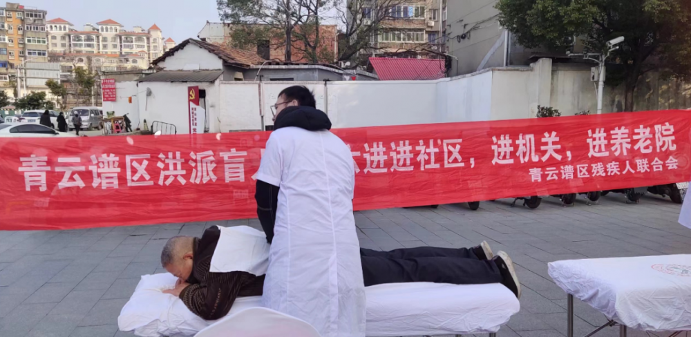 为扩大“南昌(洪派)盲人按摩”品牌影响力,满足辖区居民的健康需求,1月16日,青云谱区残联组织辖区盲人按摩汉昌店4位技师走进京山街道“巨成金山街”广场开展南昌(洪派)盲人按摩“六进”志愿服务活动。
