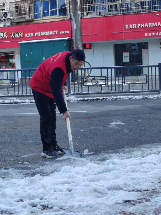 寒冷天气也阻挡不了大家扫雪的热情,忙碌的身影在大雪中构成了一道靓丽的风景线,红马甲在皑皑白雪的映衬下更加鲜艳夺目。
