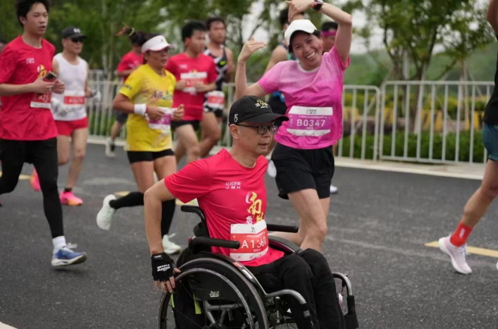 4月21日,南昌象湖半程马拉松比赛在南昌县复兴大桥东侧鸣枪开跑。来自青山湖轮椅乐跑团3名选手以轮代脚,和来自全国各地上万名跑马爱好者一起,用双手“跑”完了马拉松,他们勇往直前的奔跑英姿、自强不息的拼搏态度,成为跑场上一道特殊且亮丽的风景线。