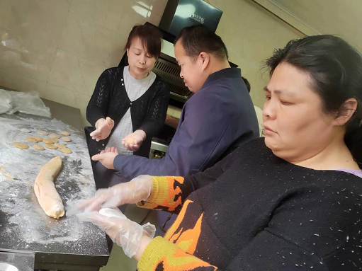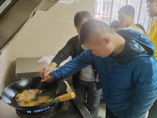 活动现场,一片欢声笑语,托养中心的志愿者老师开始细心教导,学员们有模有样的跟着老师揉制南瓜饼,在老师的带动下,学员们信心十足、干劲满满,只见他们动作麻利的把南瓜面团揉成了一个个圆饼,直到把所有的饼都做完。然后把做好的南瓜饼放入油锅里小火慢炸,不一会儿,香糯可口的南瓜饼出炉了。