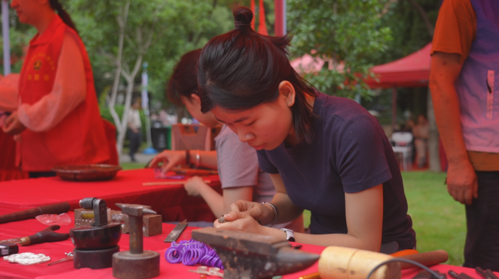 活动现场,残疾人文创作品义卖展示区成为亮眼焦点。听力残疾人裘洁正在青铜材料表面錾刻精美的花纹,达到严丝合缝、浑然天成的艺术效果。居民们纷纷驻足观看,用实际购买行动表达对残疾人的认可与支持,现场暖意融融。