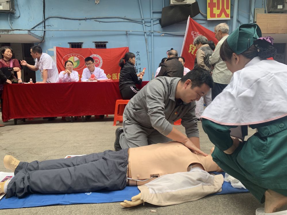 在康王庙社区庭院内,江西省中西医结合医院的党员志愿者们轮流为市民演示心肺复苏急救技能。志愿者们一边讲解心肺复苏的意义和操作方式,一边在人身模型上做示范,现场群众跃跃欲试,纷纷上前尝试操作。