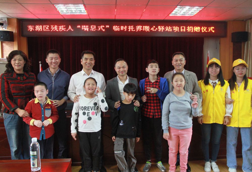 捐赠仪式由区残联负责人黄河主持,南昌市培智学校校长戴玉华作为残疾人“喘息式”临时托养暖心驿站项目承办方就该项目基本情况、实施情况、家长满意程度进行介绍;爱心企业家文捷先生讲话并现场捐赠了2万元,用于支持帮助暖心驿站的孩子们更好的享受相关喘息服务;随后,东湖区委副书记贾彧超作了重要讲话,他充分肯定了爱心企业家的善行义举,并表示推进残疾人事业发展需要全社会共同努力,希望社会各界伸出友爱之手,积极加入助残爱心团队,努力营造全社会尊重、关爱、帮助残疾人的良好社会氛围。最后,领导们与孩子、家长们和志愿者朋友亲切合影留念,鼓励家长们要树立康复信心,协助老师,积极帮助孩子们融入社会。