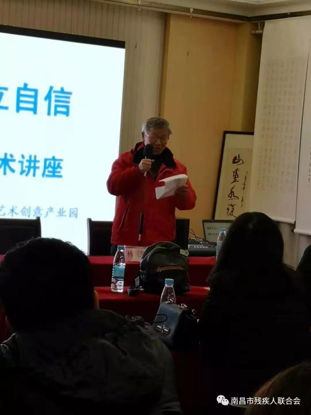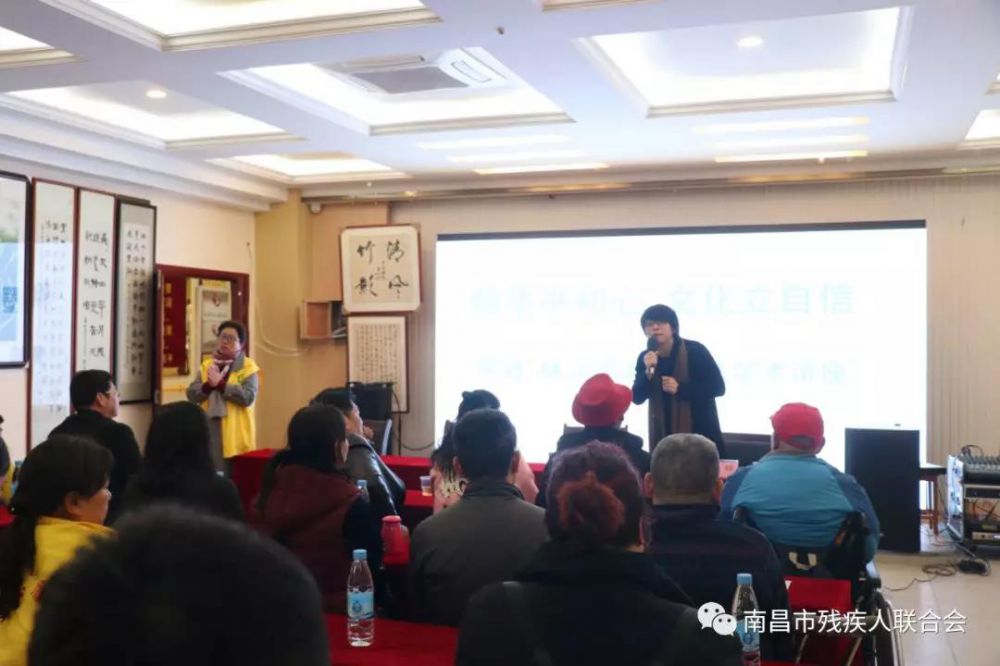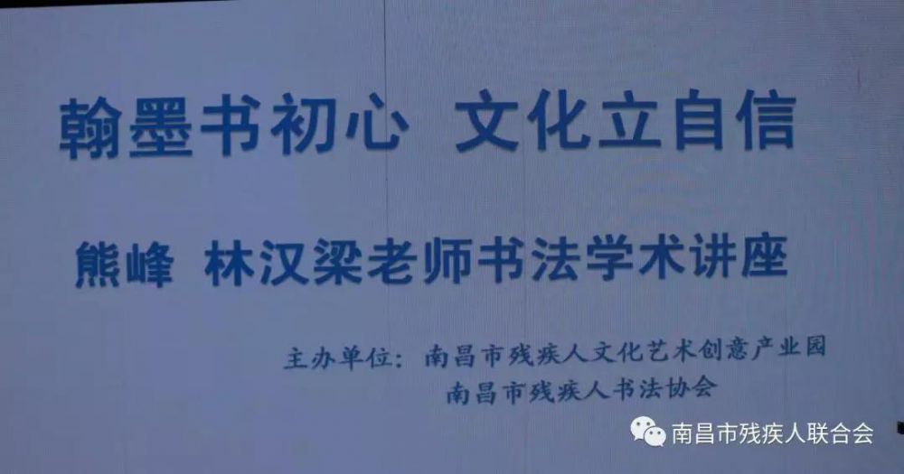 12月1日,第28个“国际残疾人日”即将来临之际,南昌市残疾人文化创意产业园温暖如春,欢声笑语。为更加活跃南昌市残疾人文化艺术生活,提升书法协会会员艺术水准,促进残健融合交流,南昌市残疾人书法协会、南昌市残疾人文化创意产业园共同主办以“翰墨书初心,文化立自信’’为主题的书法艺术交流讲座。市残联副理事长林善岳出席。特邀著名书法家熊峰先生和林汉梁老师为大家讲课。市残疾人书法协会主席吴寿国主持。