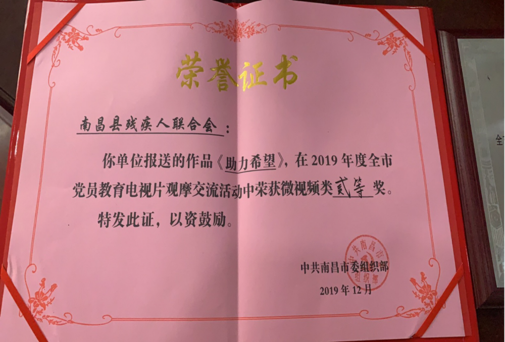 近日,2019年度全市党员教育电视片观摩交流活动落下帷幕。南昌县残联选送的作品《助力希望》荣获微视频类二等奖。这既是南昌县残联参加活动的首次突破,也是南昌县残联多年来参加此类活动的首次突破。