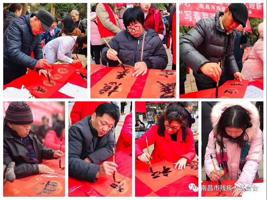 当日上午,欢愉喜庆的气氛充满手语角,到处热闹非凡。写春联、送春联、免费查牙、手语歌、手语交流等活动环节,引来了数百位聋人群众。参与写爱心春联的书法家有来自南昌市残疾人文学艺术联合会的梁娉会长、万美铃、沈证宇、杜鹉、东湖区老聋人书法家贺翘陆、西湖区聋协主席康宏军及他的学生邓曦宁等。他们在场挥毫泼墨,一幅幅散发着浓浓墨香的喜庆春联展现在人们眼前,引发一阵又一阵喝彩,领到春联的聋人群众个个都笑颜逐开兴高采烈,每个人脸上洋溢着欢乐和谐。