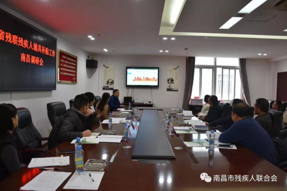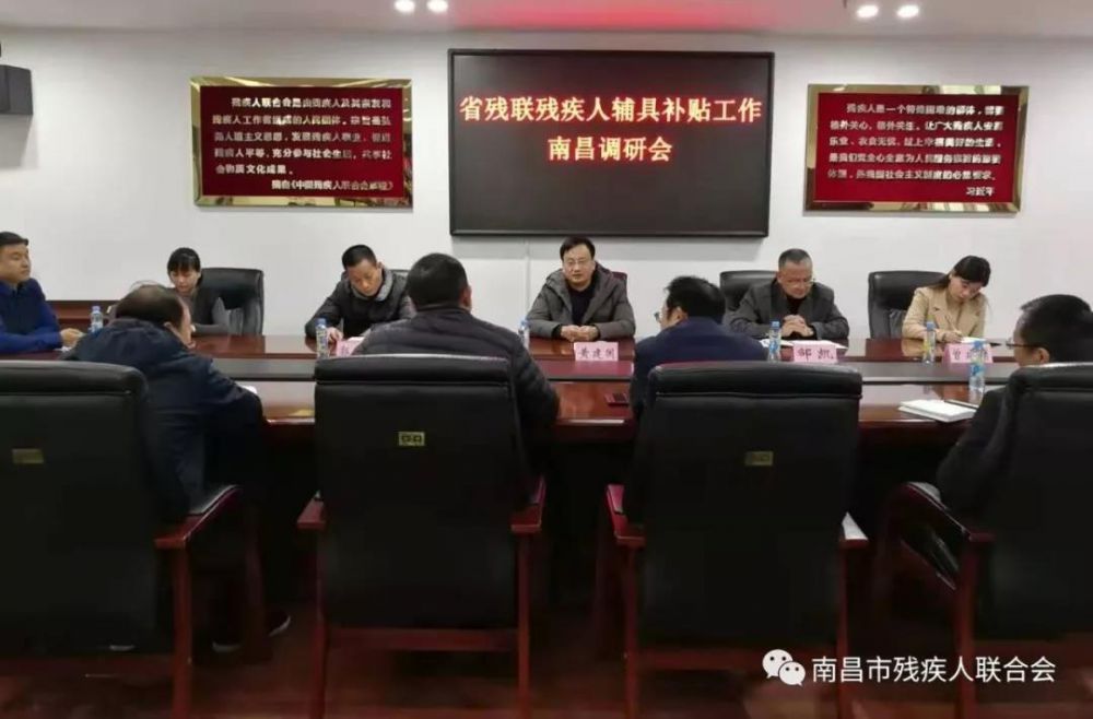 1月7日上午,省残联副理事长黄建国,康复处处长邹凯,调研员曾建莉,省辅具中心主任郭宏志等一行六人在我市调研残疾人辅助器具适配补贴工作,并与有关同志进行了座谈。南昌市残联党组书记、理事长余颖主持会议。