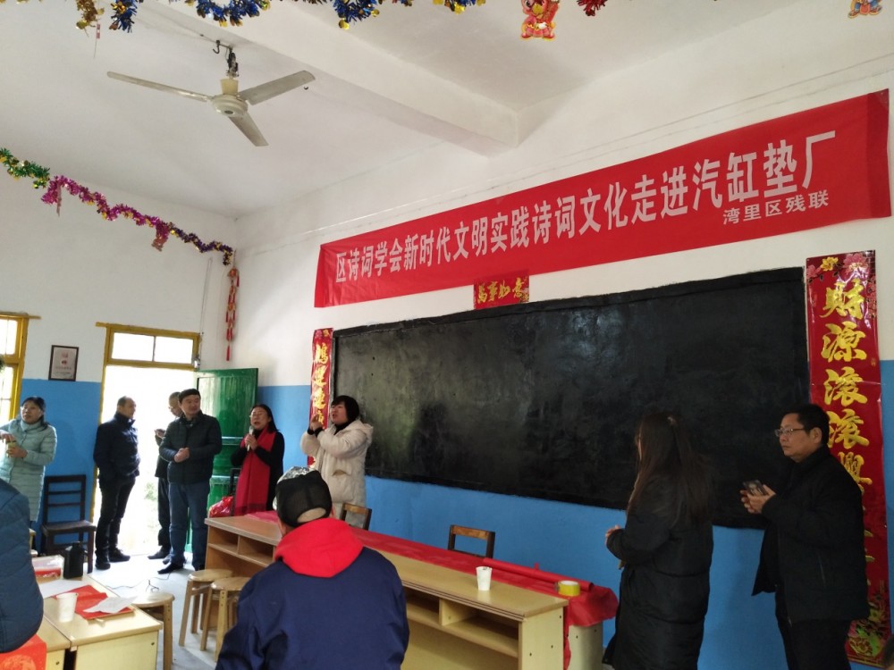 为迎接2020年新春佳节的到来,湾里区残联于2020年1月14日在湾里区汽缸垫厂举办新时代文明实践诗词文化活动,我会特邀请南昌市诗词学会和湾里区诗词学会以“喜迎新春、欢度佳节”为主题,帮助厂内聋哑职工实现文化脱贫,为汽缸垫厂残疾朋友书写春联,宣传和展示中国诗词文化魅力。活动期间,大家以诗会友、以字会友,与残疾朋友一起,提前欢庆春节。