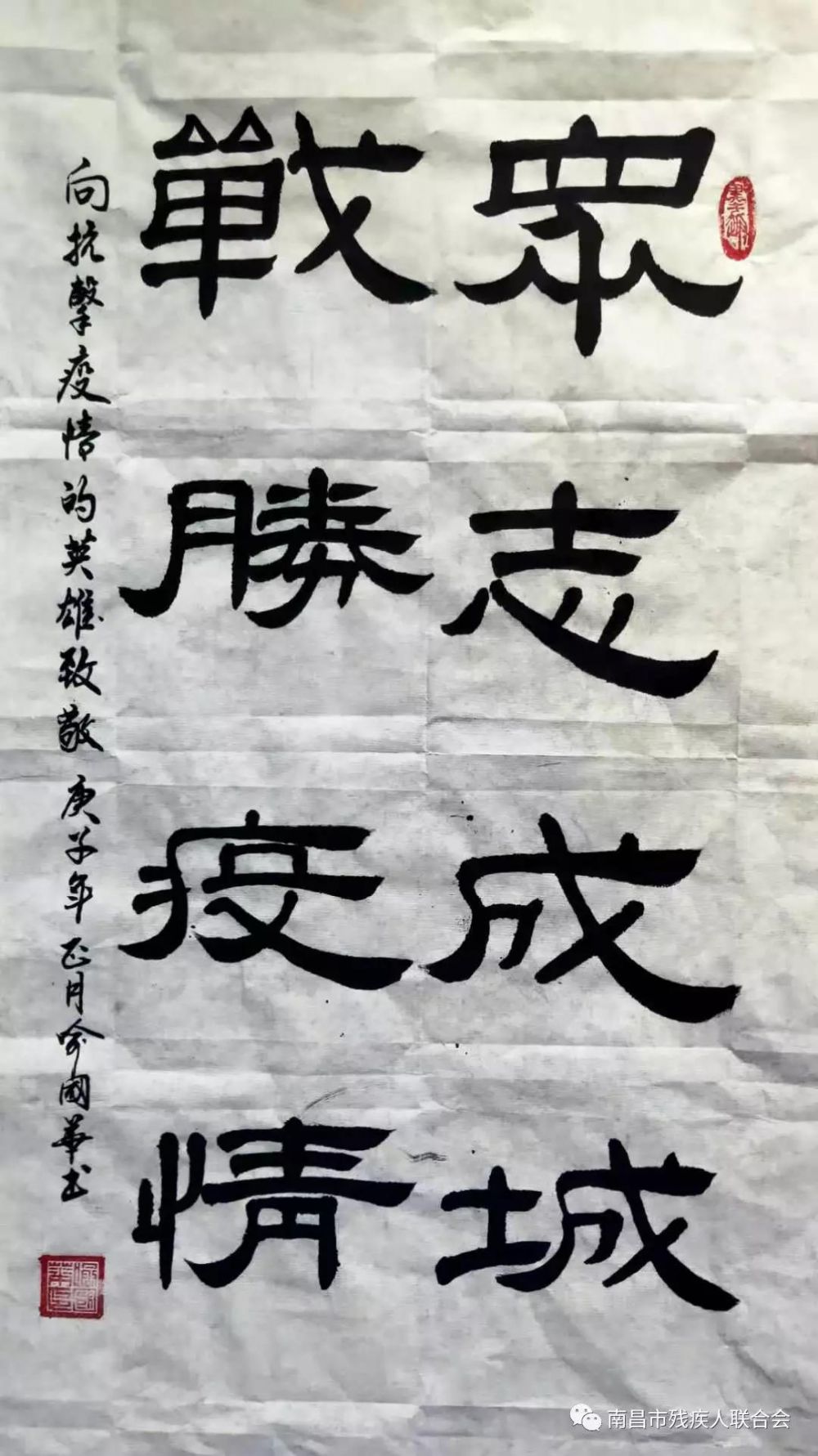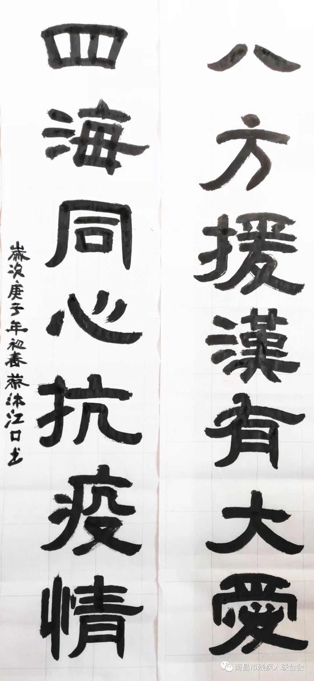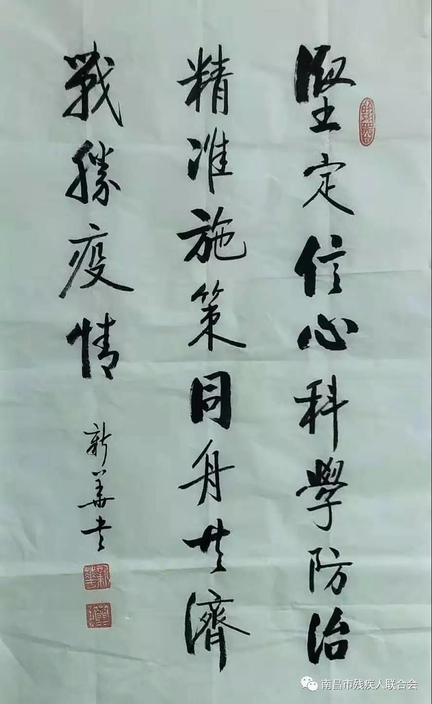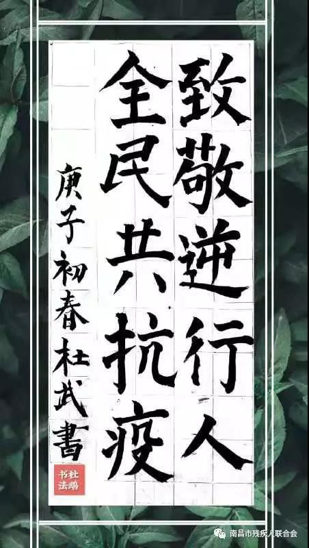 2020新春,一场疫情突袭我泱泱中华,全国人民在以习近平同志为核心的党中央领导下,万众一心,迅速投入抗疫阻击战。南昌残疾人书法协会与南昌残疾人写作协会共同倡议,疫情当前,我们虽不能冲到前线,但我们能用诗词书画表达情感,用一颗颗滚烫的爱国之心, 积极创作,讴歌奋战在一线勇士们!与全国人民心手相牵,共克时艰,为早日打赢这场硝烟的战争加油助力!