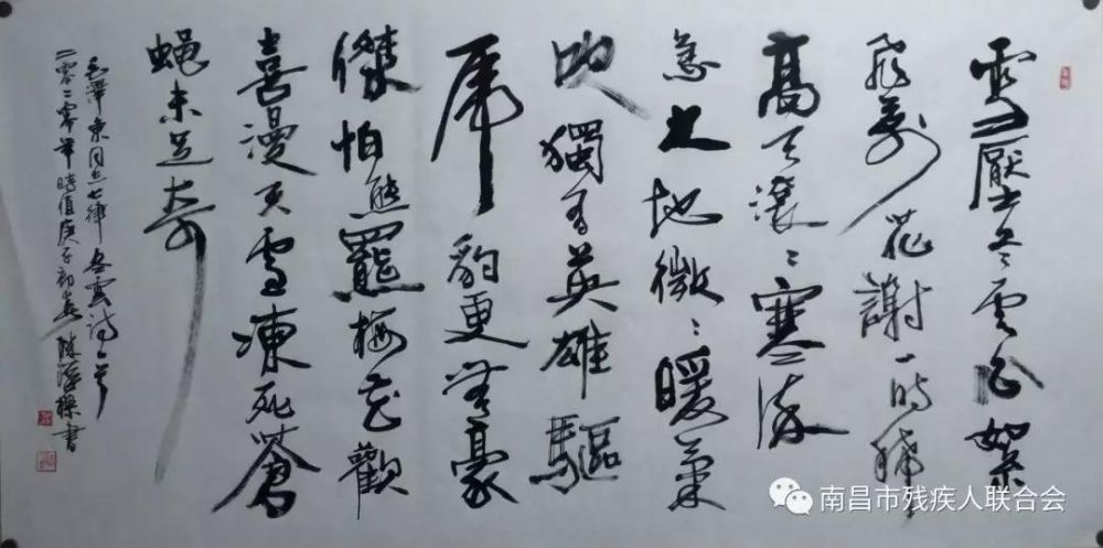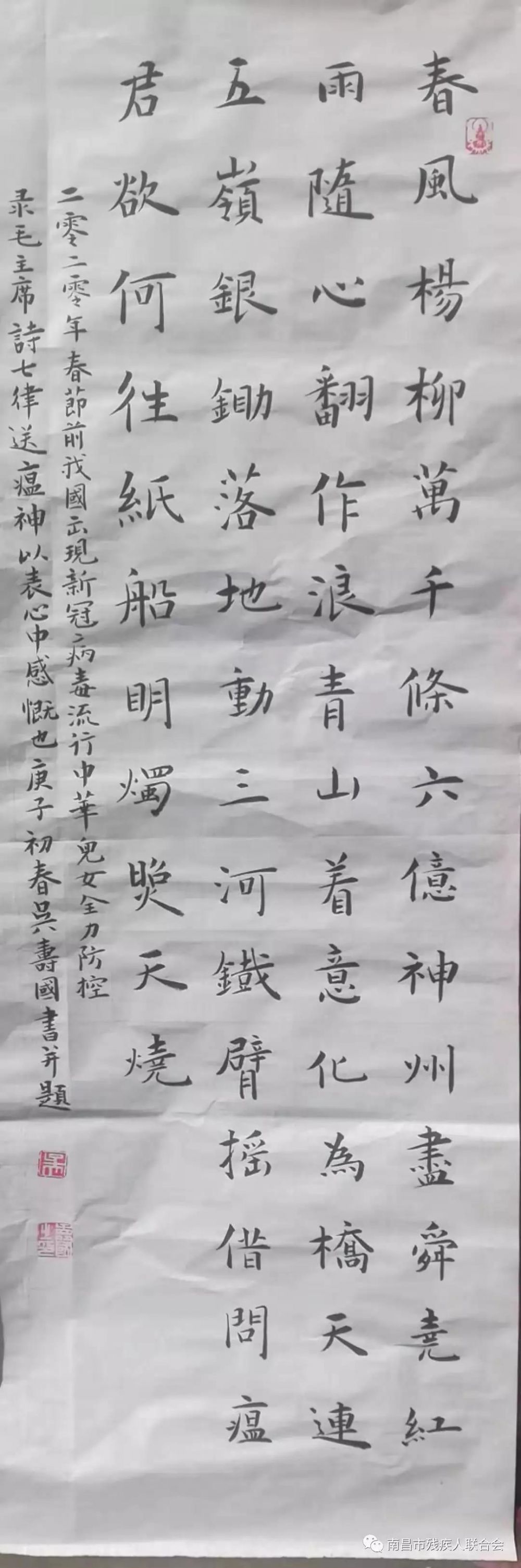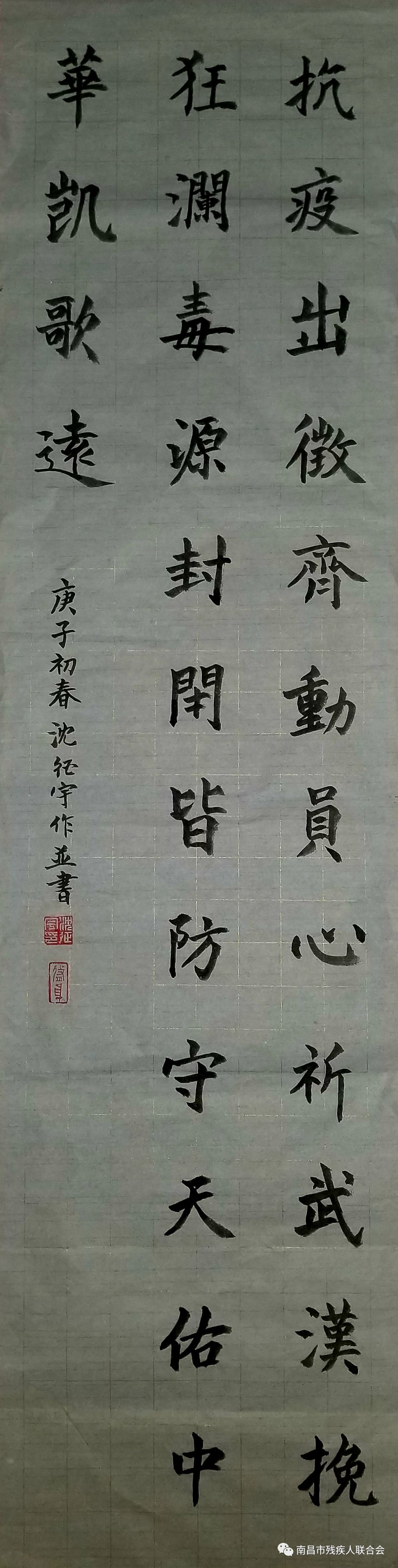 2020新春,一场疫情突袭我泱泱中华,全国人民在以习近平同志为核心的党中央领导下,万众一心,迅速投入抗疫阻击战。南昌残疾人书法协会与南昌残疾人写作协会共同倡议,疫情当前,我们虽不能冲到前线,但我们能用诗词书画表达情感,用一颗颗滚烫的爱国之心, 积极创作,讴歌奋战在一线勇士们!与全国人民心手相牵,共克时艰,为早日打赢这场硝烟的战争加油助力!