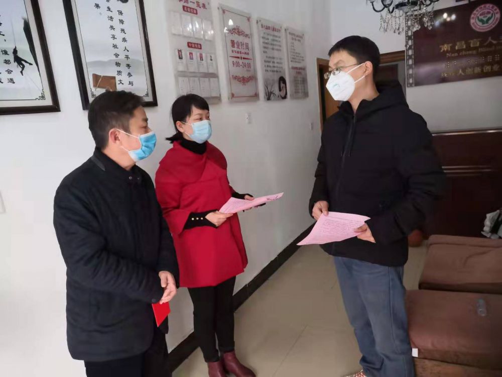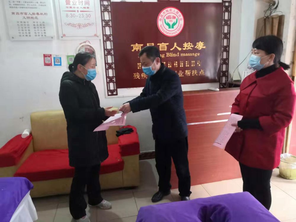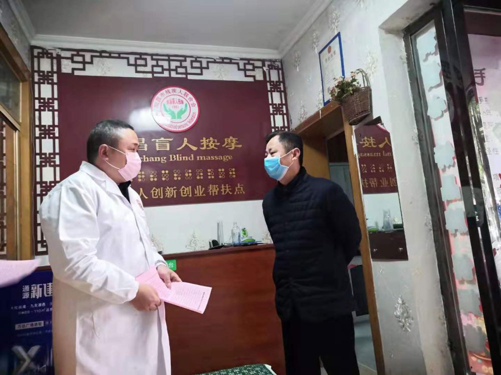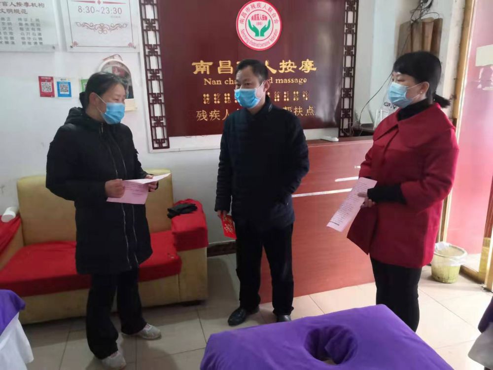 为认真贯彻落实习近平总书记对新型冠状病毒感染的肺炎疫情防控工作系列重要讲话和批示精神,以及党中央、国务院、省委、省政府、市委、市政府、区委、区政府对新型冠状病毒感染的肺炎疫情防控工作的重要指示精神, 2月5日上午,区残联理事长罗水根率部分党员干部到区盲人按摩店巡查疫情防控工作。他详细了解各按摩店的相关防疫消毒情况,发放了《新建区残联给全区残友及助残机构的一封信》,并叮嘱大家要根据区疫情防控指挥部的相关要求,暂停一切经营活动,坚决防止因人员聚集引起交叉感染,同时加强对店内的清洁消毒,同时做好自身的防护工作,确保安全。