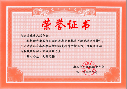 防控期间,区残联向区疫情防控指挥部捐赠口罩600只,向挂点社区——大院街道二七北路社区捐赠口罩200只。同时,区各残疾人专门协会在疫情防控中发挥积极作用,区聋协提供口罩购买信息150只;区肢协、区盲协向区红十字会捐赠爱心善款共计760元,用于此次疫情防控工作。除此之外,东湖区残疾人艺术团凝心聚力,创作了朗诵《行英雄事,做平凡人》、快板《万众一心战疫情》等一系列优秀群众作品,共同为祖国母亲加油鼓劲。