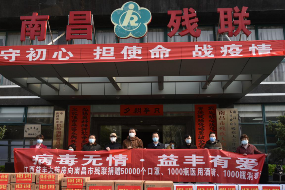 3月10日上午,江西益丰大药房连锁有限公司“病毒无情、益丰有爱”主题爱心捐赠活动在南昌市残联启动。江西益丰大药房通过南昌红十字会向南昌市残联无偿捐赠50000个医用一次性口罩、1000瓶消毒液、1000瓶医用酒精及1000盒双歧杆菌四联活菌片,用爱心守护残疾人朋友和残疾人工作者的安全和健康,也为来势汹汹的新冠肺炎疫情防控工作尽绵薄之力。