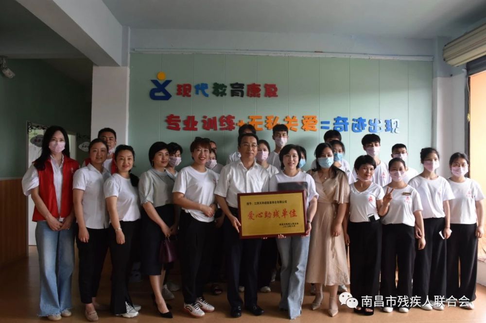 余颖向爱心企业江西天和道能量养生有限公司的善举表示衷心的感谢,并向江西天和道能量养生有限公司胡小凤董事长颁发了“爱心助残单位”牌匾。随后,余颖理事长和胡小凤董事长一起走入自闭症儿童和听障儿童中间,与孩子们亲切地交流、互动,并送上节日的礼物和祝福。