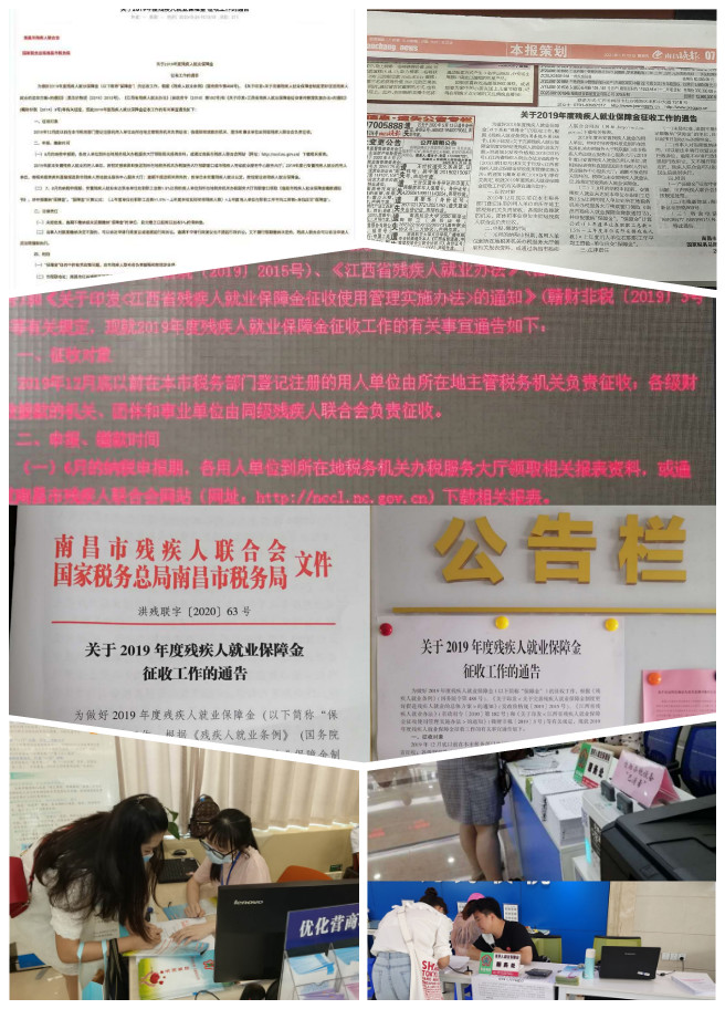 5月份开始,市残联利用报纸﹑网站﹑新闻媒体等渠道多方向的宣传就业年审政策,分别在南昌日报﹑南昌晚报﹑南昌市残疾人劳动就业服务中心网站﹑南昌广播电视台新闻综合频道(一套)新闻说报栏目发布了征收通告,对残疾人就业保障金征收工作进行了广泛宣传。