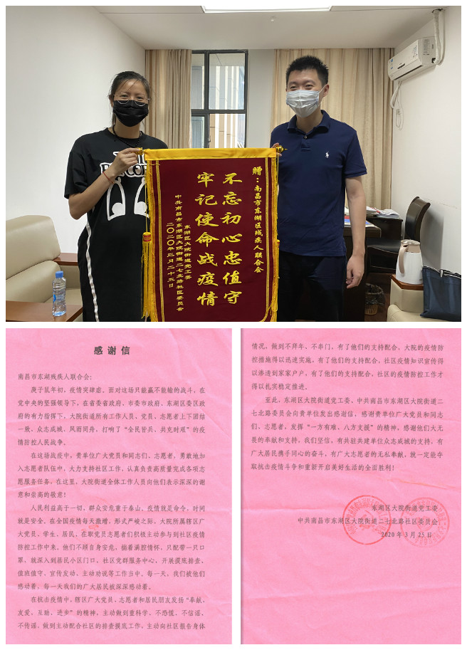 “区残联党员干部在疫情期间为我们社区防疫工作付出了很多,送来锦旗和感谢信就是表达我们的感谢。”二七北路社区表示。锦旗代表着一份认可,更代表一份责任和激励,也将成为区残联今后工作中的动力之源。