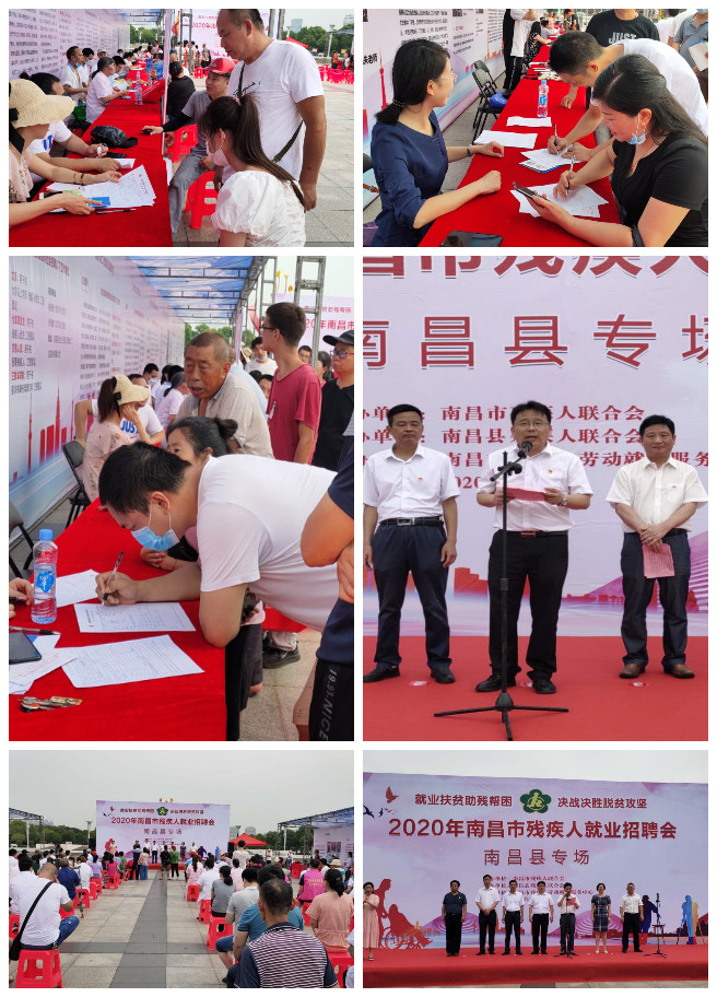 为贯彻党中央打赢脱贫攻坚战决策部署,落实人力资源社会保障部办公厅、中国残联办公厅《关于开展2020年农村贫困残疾人就业帮扶活动的通知》文件精神,彰显省会担当,展现残联作为,推进残疾人就业,助力脱贫攻坚,2020年6月23日上午,以“就业扶贫助残帮困 决战决胜脱贫攻坚”为主题的南昌市残联2020年第三场残疾人就业招聘会(南昌县专场)在美丽的南昌县澄碧湖畔举行。本次招聘会由南昌市残疾人联合会主办,南昌县残疾人联合会协办,由南昌市残疾人劳动就业服务中心承办。市残联党组成员、副理事长吴卫平出席活动并发表讲话,市残联教就处处长宗慧民主持活动。南昌县残联理事长涂义平、市残疾人就业中心主任张望初出席招聘会活动。