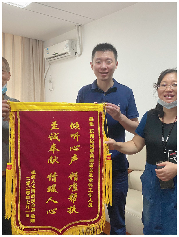 7月3日,东湖区前期享受了喘息服务的智力残疾人王博威家属向东湖区残疾人联合会赠送了一面写有“倾听心声、精准帮扶、至诚奉献、情暖人心”的锦旗,感谢区残联对残疾人家庭的关心和帮扶。