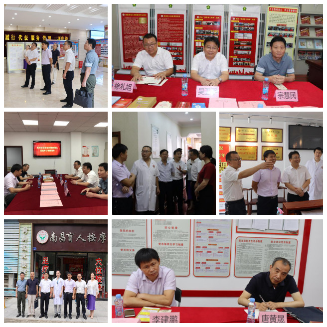 考察组一行首先来到市残联机关大楼一楼听取了我市残疾人概况、残疾人工作“龙腾”策略、党建“555”品牌创建等工作展板介绍。南昌市残联以“严、细、实、快、担”工作作风,奋力实施“龙腾”工作策略,努力实现“全省站首位,全国列前位”工作目标的做法,获得了考察组的双手点赞。随后来到二楼盲人按摩实训基地展开座谈,吴卫平表示南昌市残联通过多举措、多途径大力发展南昌盲人按摩工作,外塑形象、内强素质,按照中残联对南昌“规范化管理、标准化评价、规模化带动、市场化运行”的工作要求,努力实现“南昌盲人按摩”产业连锁品牌化,更好地促进广大盲人创业就业。徐礼旭详细介绍了“南昌盲人按摩”的发展历程、市盲导中心机构成立及近几年的工作,就“五统一”打造、“六进”活动、“七个提升”以及最近展开的“十佳优秀机构”和“二十佳技术能手”评选活动和今年即将开展的重点工作,传达了把“南昌盲人按摩”融入市民休闲生活的理念。双方还就如何做好残疾人脱养工作进行了经验交流。