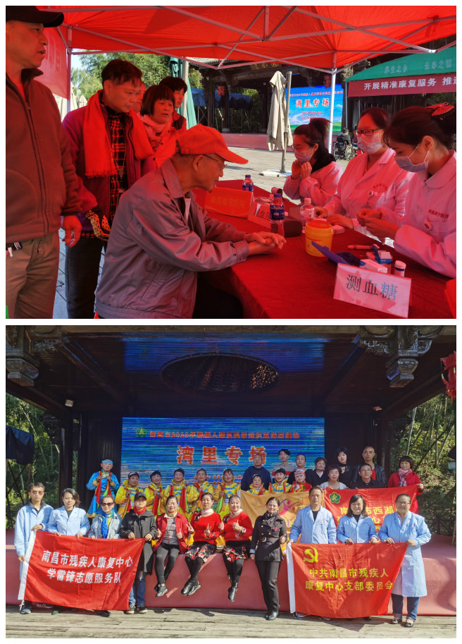 活动现场,悬挂了知识宣传标语和横幅,摆放了残疾预防和康复知识宣传展板,宣传了残疾人康复工作的重要性。咨询台前,医院专业医生为群众进行量血压、测血糖和健康指导等义诊服务;市残疾人康复中心向居民发放了康复宣传折页和预防知识手册,并为他们答疑解惑;演出台前,演员们用自己的专业擅长向群众表演了快板、三句半、歌曲等节目,用有节奏的说唱说出了康复知识的精髓和南昌残疾人工作的发展、用嘹亮的歌声唱出了感动和感恩、用动人的舞姿舞出了朝气和希望,现场气氛热烈,赢得了观众的好评和称赞。同时为充分展现南昌助残精神,市残疾人康复中心党员志愿者们在活动现场还为2020年助残新闻人物、辅具技术宣讲案例等进行拉票,用实际行动助力江西南昌残疾人事业。