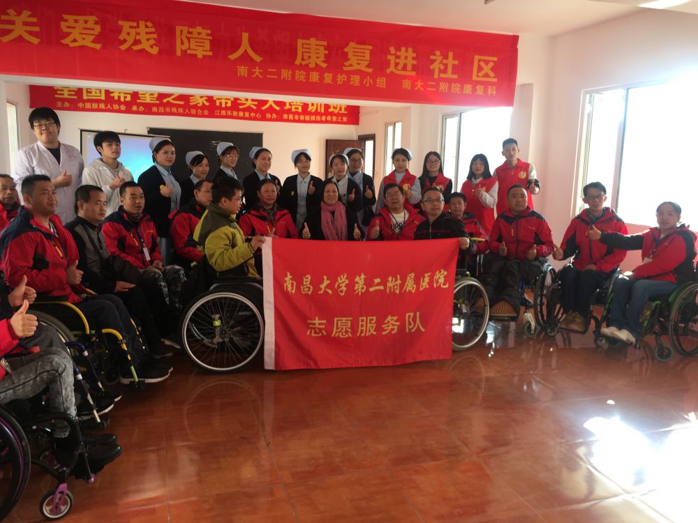 2018年11月28日,“国际残疾人日”前夕,南昌大学第二附属医院康复医学科医护人员来到南昌市脊髓损伤者“希望之家”,为包括“全国希望之家带头人培训班”学员在内的脊髓损伤伤友免费测量餐前血糖、餐后血糖、血压,向伤友们讲解《神经源性膀胱的治疗》知识、演示间歇导尿的操作方法。