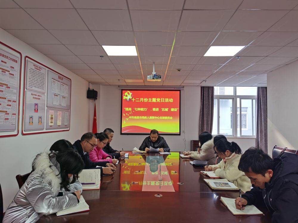康复中心围绕12月主题党日活动的主题:提高“七种能力”,推进“五城”建设,组织全体人员集中学习了《2020年12月“主题党日”学习资料汇编》内容。会上,学习了《中共中央关于制定国民经济和社会发展第十四个五年规划和二0三五年远景目标的建议》,大家对此内容谈认识,言体会,认为实现“十四五”规划和二0三五年远景目标意义重大,任务艰巨,前景光明。康复中心主任杨昕强调:作为一名党员,应当牢记习近平总书记的谆谆教导,在“七种能力”上下真功夫;作为南昌一份子,在推进“五城”建设上下硬功夫;作为一名残疾人工作者,要在“五个走在全国前列”下苦功夫,只有这样才无愧于初心,无愧于新时代。