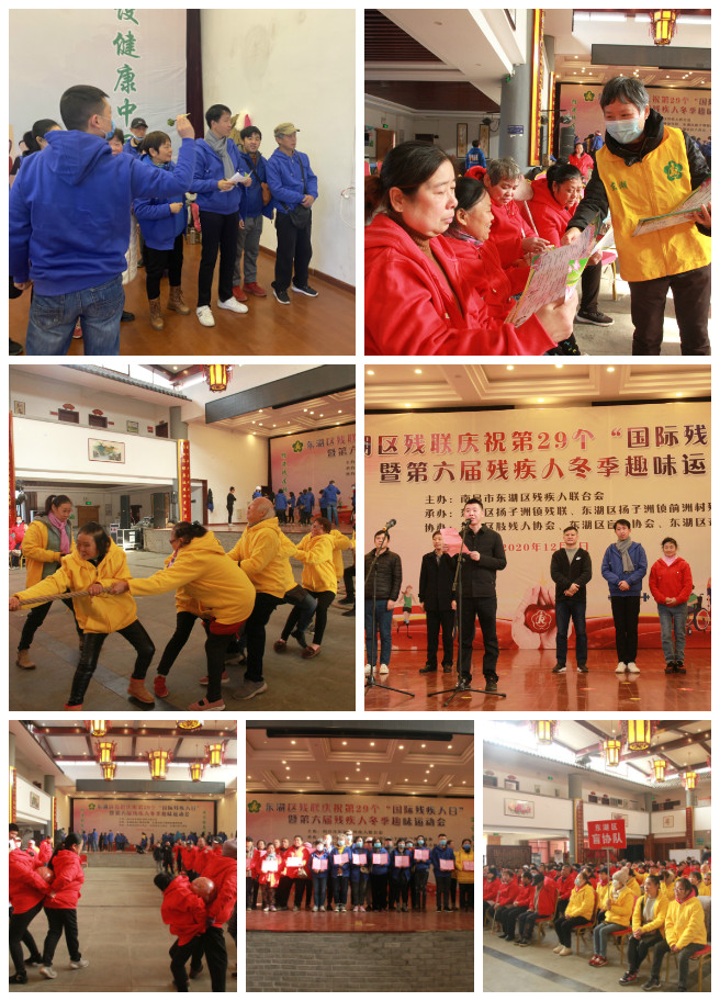 为热烈庆祝第29个“国际残疾人日”,进一步增强残疾人身体素质,2020年12月5日,由东湖区残联主办,东湖区扬子洲镇残联、东湖区扬子洲镇前洲村残协承办,东湖区肢残人协会、盲人协会、聋人协会协办的第六届残疾人冬季趣味运动会在扬子洲镇前洲村文化大院成功举办。东湖区扬子洲镇前洲村书记陶晓弟致开幕词,东湖区残联理事长黄河讲话。东湖区扬子洲镇副镇长郭名新、扬子洲镇残联理事长郭艳峰、东湖区肢残人协会主席万美玲、盲人协会主席黄建发、聋人协会主席李焕秋参加活动。